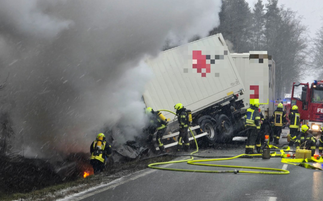 Am 03.01.2025 kam es an der Kreuzung Deponiestraße/L1076 zu einem schweren Verkehrsunfall zwischen einem Lkw und einem Pkw. Das Führerhaus des Lkw stand bei Eintreffen der Einsatzkräfte in Flammen, ebenso der darunter eingeklemmte Pkw.